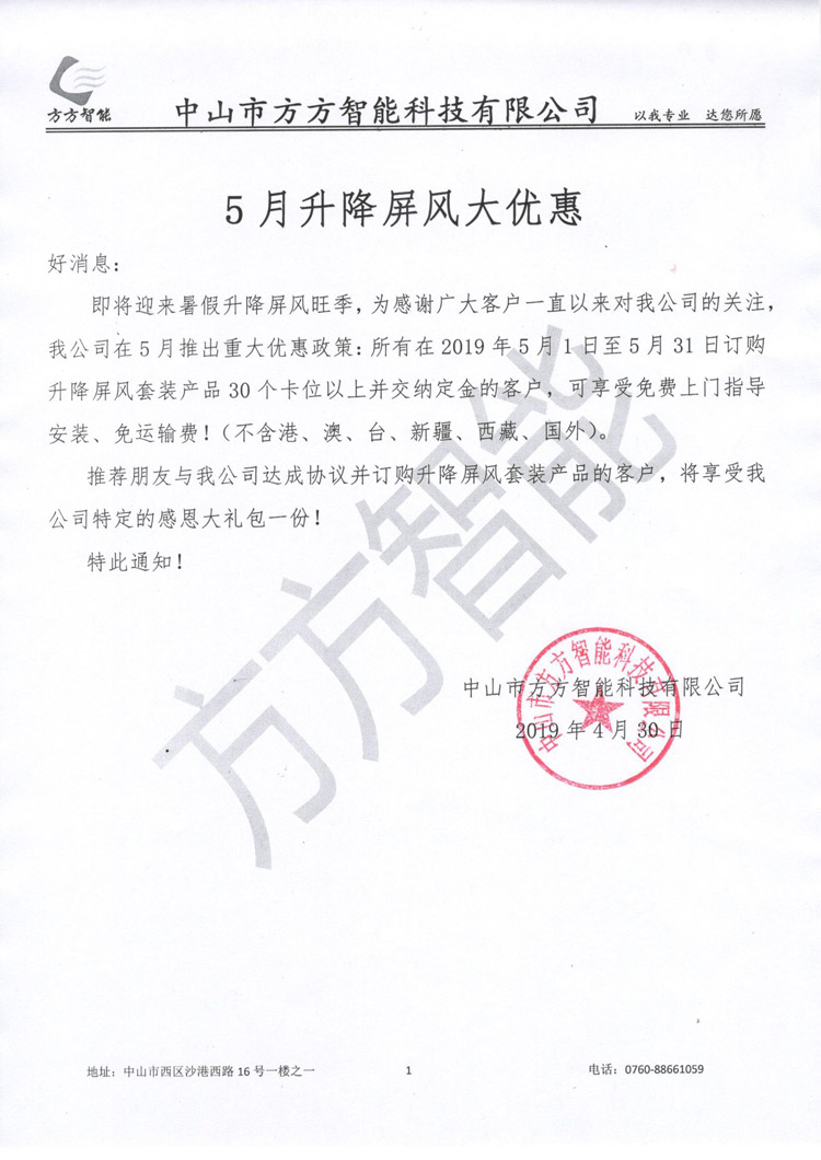 四月再见,迎接五月,方方智能科技升降屏风优惠来了!凡在五月份订购升降屏风,我司将提供免费上门指导安装服务,免运输费,想了解更多优惠信息欢迎咨询本公司。